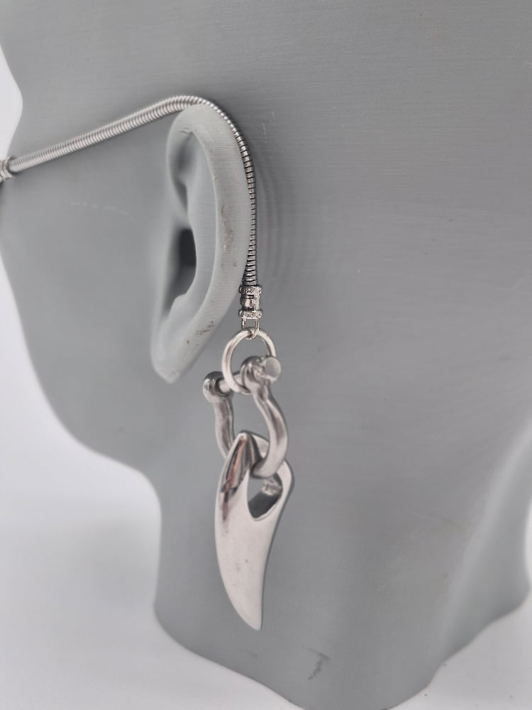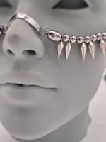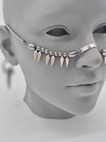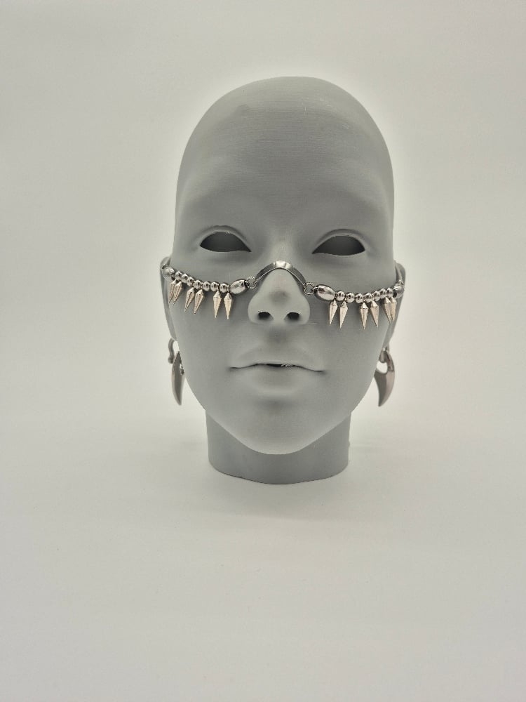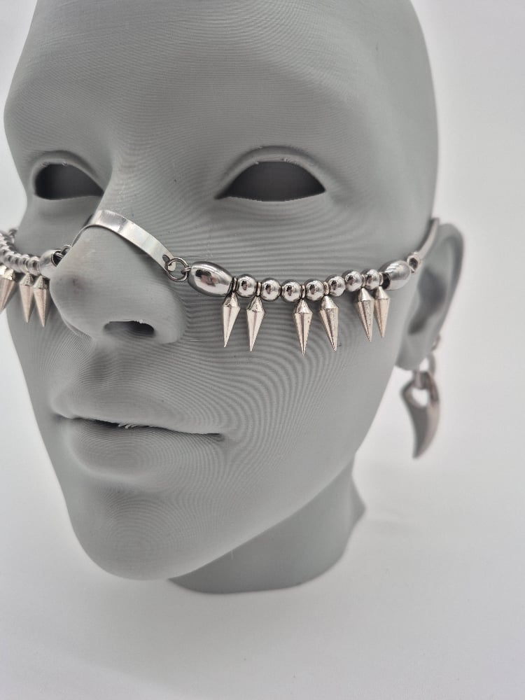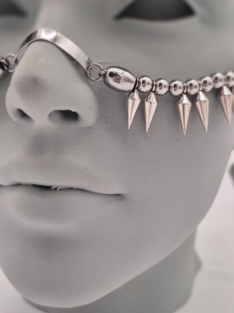 All stainless steel, all shine — no fluff. No wings on this one, just heavy-hitting spike energy and steel bead drip that hugs the cheekbones like a sculpted exoskeleton.