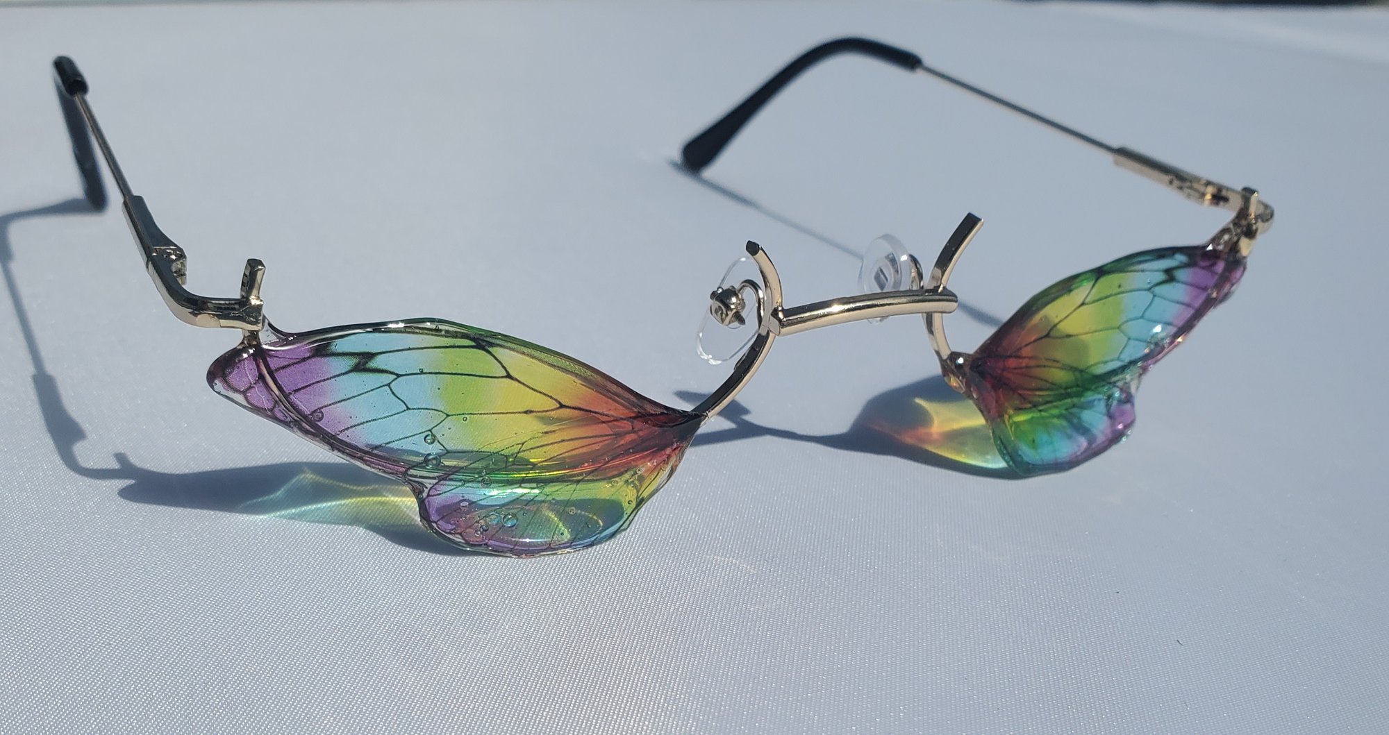 Rainbow cicada style wings handcrafted resin work onto golden frames.