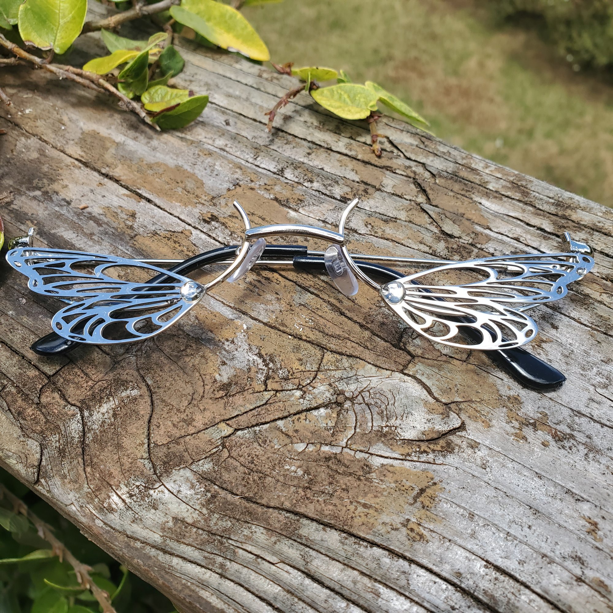 Silver butterfly style wing on silver metal frames. No lenses. Ships within 5 days of order.